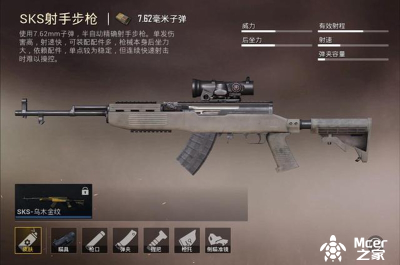 SKS的强悍就在于满配的情况瞬间无后座5连发,打的敌人瞬间倒地,但是相对来说最佳配件搭配还是较难的,而SKS详情如下: