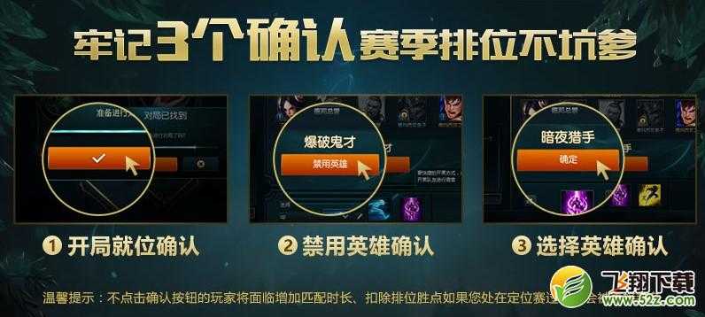 为保证玩家认真对待每一局游戏,并且大大缩短玩家的匹配时长,请大家一定要记得点击3次确认哦!如果不点击确认按钮,玩家将面临增加匹配时长、扣除排位胜点,若您处在定位赛过程中将会被直接判负。