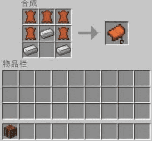 马鞍合成是很容易的,有皮革铁锭即可,只要把这两种材料摆放正确即可合成马鞍,如下图所示。