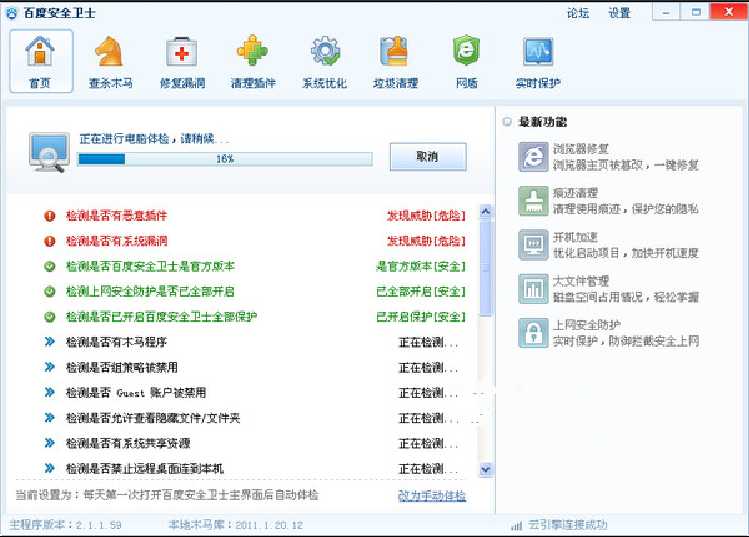百度安全卫士是一款提供个人电脑安全防护的免费安全软件。采用金山领先的云安全技术,能查杀上亿已知木马,还能5分钟内发现新木马;漏洞修复速度更快;同时实时保护、插件清理、修复IE等、网页木马过滤、下载保护等功能,全面保护电脑系统安全。