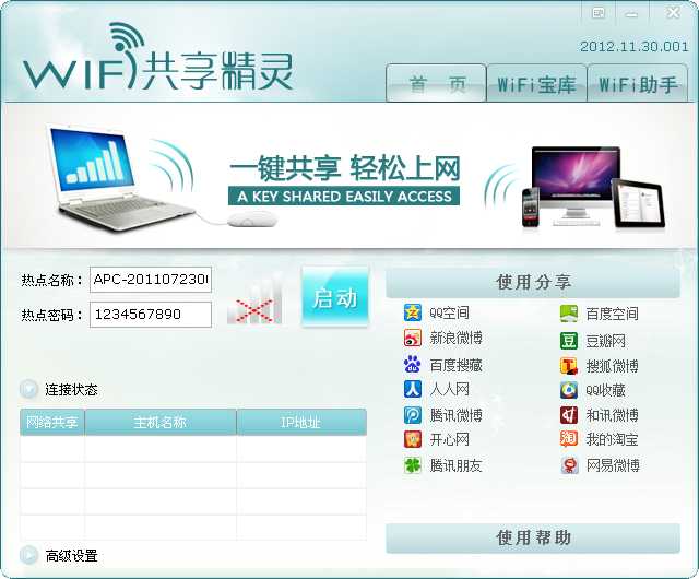 2、使用方便:智能识别互联网网卡和无线网卡,无需手工选择。智能一键开启WIFI共享,简单方便,无压力;