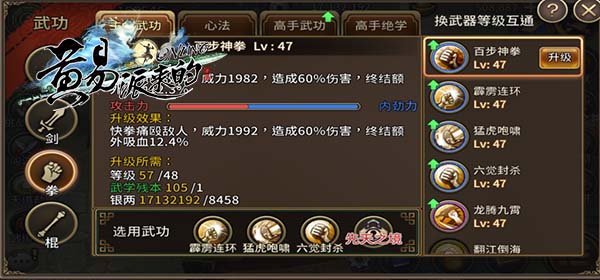 武功分为主角武功、心法、高手武功和高手绝学,游戏内可用武学残本、心法残卷等,可用于提升特定武功或心法的等级。