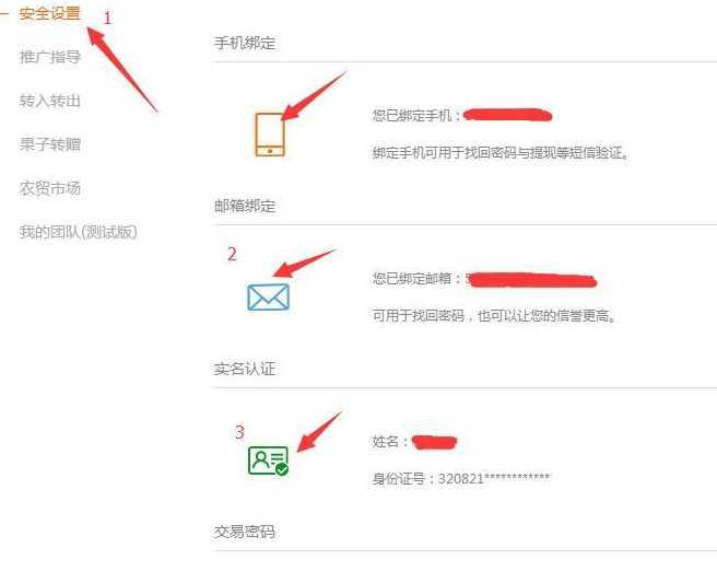 第二步:进行安全认证:绑定邮箱,实名认证,设置交易密码 ---如下图
