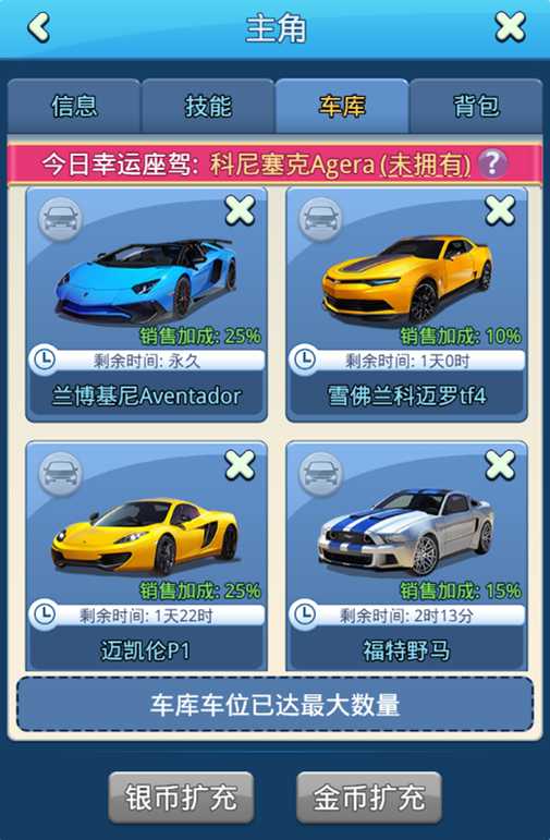 每台跑车将对您名下的店铺有不同程度的销售加成,跑车等级越高加成越高!