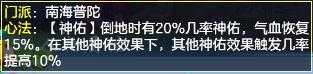 【神佑】倒地时有一定概率神佑,恢复一定比例的气血;在其他神佑效果下,其他神佑效果触发几率将有所提高