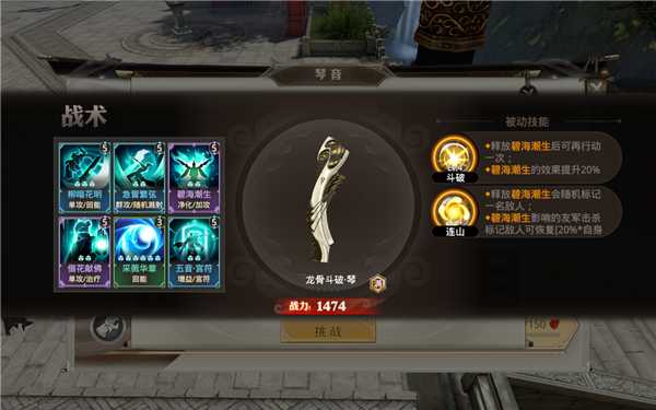“琴音”的入门试练需要满血通过试练才能获得完美的三星奖励。首先要了解的是“龙骨斗破·琴”的被动技能可以在使用招式“碧海潮生”后触发,使得玩家可以再额外行动一次。