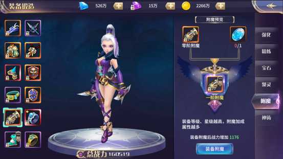 通过各装备的附魔石提升属性战力,附魔石是根据佩戴的装备而取名设定,例如:武器附魔石、项链附魔石、手套附魔石、护符附魔石等