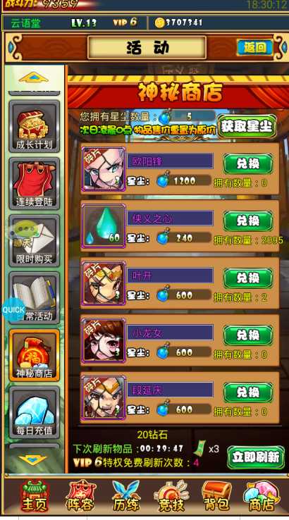 神秘商店里有你需要的人物,装备,和材料。每隔一个小时,就积累一次免费刷新次数。VIP等级越高,可以积累的免费刷新次数越高。经常刷新神秘商店,如果刷出你需要的卡牌,你会万分兴奋的。