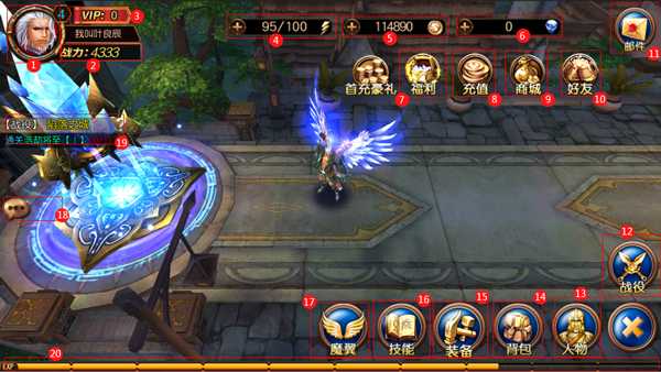 14. 背包:点击打开玩家背包,玩家可在背包中整理或使用自己的物品,玩家通过各种途径获得的物品也将进入背包中,可在背包中找到。
