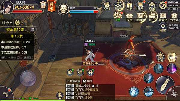 选择好职业后,进入游戏,你已经进入《剑荡八荒》的世界了。玩家可以观察屏幕左侧的任务栏,跟着主线任务走,与NPC对话接取任务并前往去完成任务。前期任务主要以找人和刷怪为主,打人或刷怪时可以选择手动攻击和自动攻击。手动攻击就是左手控制方向,右手控制技能,打出华丽的操作和伤害;自动攻击就是点击屏幕右侧的挂机,让其自动攻击敌人。