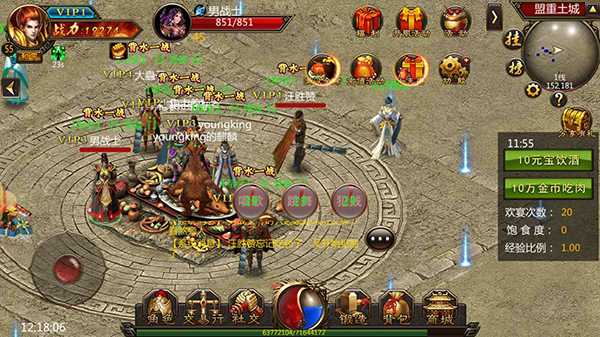 《荣耀战争》里还有一个可以坐享其成,轻松拿经验的活动就是每天中午12:10在土城准时开启的【满汉全席】了!参与【满汉全席】活动的限制是45级以上的玩家,在活动中你只要站在土城的安全点内就可以自动获得经验,并且可以通过“饮酒”“吃肉”的方式增加饱食度,饱食度越高获得经验的加成越高,饱食度的增加需要元宝或者银币购买。