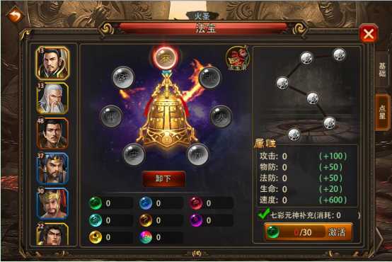 2.法宝可通过点亮将星来提升属性;点将星需挑战成功对应武圣,方能点亮其将星