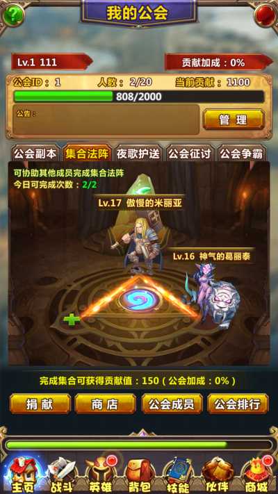 作为一款挂机游戏,公会中也有一个十分休闲的玩法哦,那就是集合法阵。每日只有两次可以获得贡献值的奖励哦,但是完成两次后,就没有奖励了。给小伙伴们一个小提示:小编每天都会约两个好基友同一时间去集合法阵哦,这样就不用等别人来结义,小编和另外两个好基友就一起完成两次集合法阵,轻轻松松拿到150贡献值。