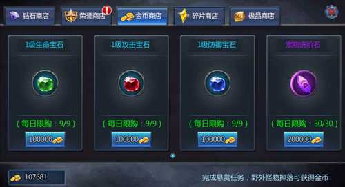 最后,来聊一聊金币商店,商店里面可以用金币买到各种宝石和宠物进阶石哦,这些都是非常有用的素材!