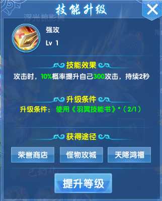 达到特定阶数的羽翼会解锁一个新的技能,羽翼技能为状态技能,随机触发技能效果。