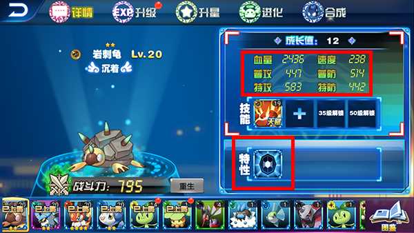 在“详情”界面的右侧,可以查看精灵的成长值,能看到精灵的血量、普攻、特攻、速度、普防、特防,还有该精灵特有的特性: