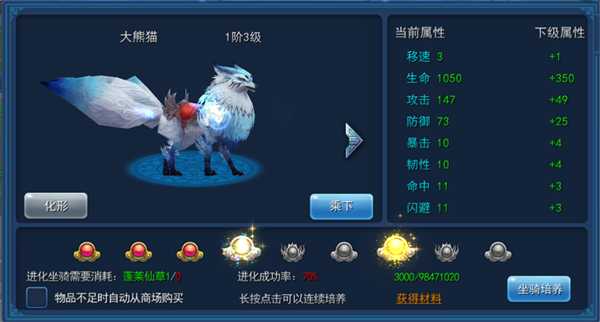 在提升坐骑进化等级的同时,进化的成功率将由百分百逐渐下降。进化等级越高,每次强化的成功率也将越低,想要将坐骑进化到最高等阶可是一项不小的挑战呢。