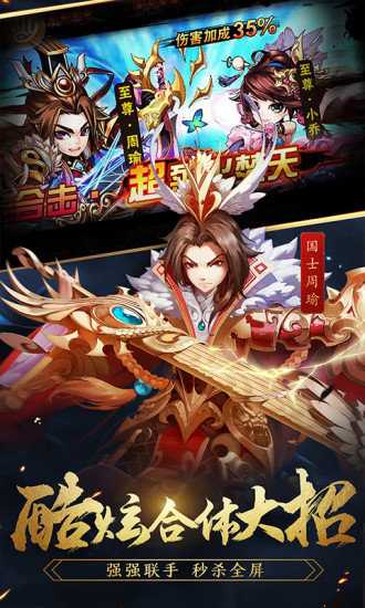 首款能释放合体技能的手游!例如鬼神吕布与同阵营武将共同上阵,可释放合体技"十方俱灭",威力逆天;武圣关羽可与同阵营主角释放合体技"御龙强袭",秒杀全屏!这里,武将缘分不只是数值,合体技爽到屏碎!