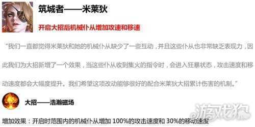 解析:米莱狄这个英雄的厉害之处在于,即便没有兵线,她也能依靠机械仆从进行拆塔。在对线时,机械仆从能够带给敌人高额的伤害,让敌人残血不敢逗留,从而将兵线推进。本次更新给米莱狄的大招新增了给机械仆从增加攻速和移速的效果,让得她在对线时一套技能命中敌人,开启大招,光是机械仆从就能给敌方造成可观的伤害,且推塔能力也有大幅度提升。但米莱狄的缺点也很明显,没有良好的位移技能,只能依靠闪现来躲避致命伤害。当敌方的突进型英雄很多时,还是建议米莱狄走“拆塔流”的路线,利用机械仆从高伤害,数量多的特性,骚扰、拆塔,配合队友取得胜利!