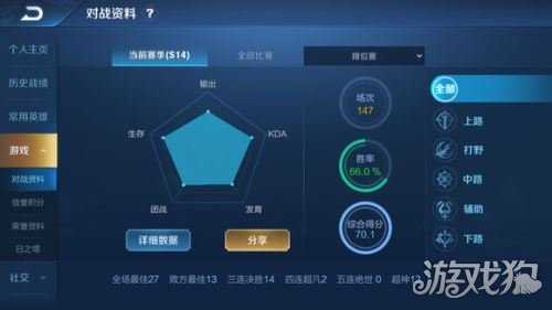 评分指的是五角图,在个人资料卡的游戏资料里,评分是反映一个人真实水平的最好写照(带打上去的除外)。一个正常的,符合所在段位实力的玩家,评分至少应该在60-70之间,这表示在这个段位,是符合本段位实力的(60多一点和68 69的人当然实力不一样)。70+表示具有超出当前段位实力的大佬和实力型玩家,60以下就是各种混子(其实我觉得65以下的都是混子)。
