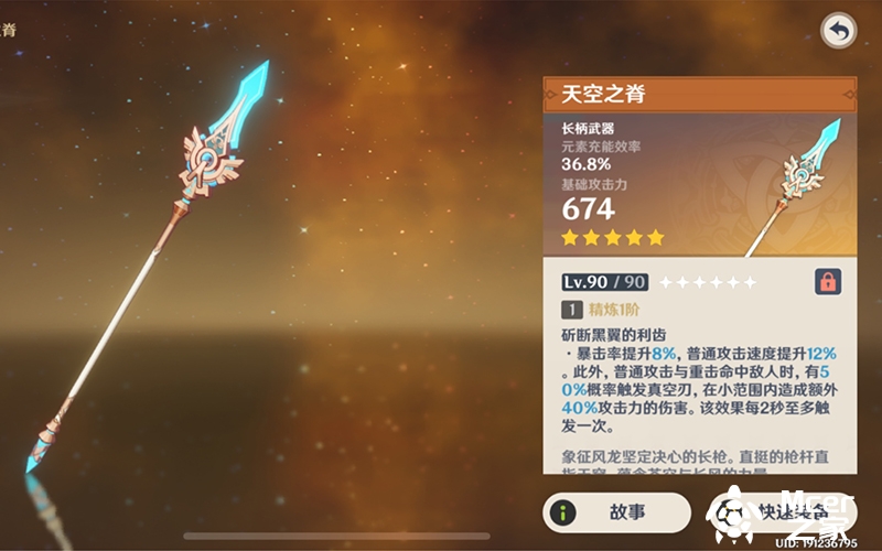 天空之脊有着674的基础攻击力,副属性为36.8%的元素充能效率。伤害能力上,因为副属性的充能收益没计算进去,所以比不过通精炼的部分四星武器。但魈是一个依赖大招的角色,天空之脊副属性的元素充能效率可以很大程度上解决魈的充能问题。所以强度方面,天空之脊是要比同精炼的四星武器好的。